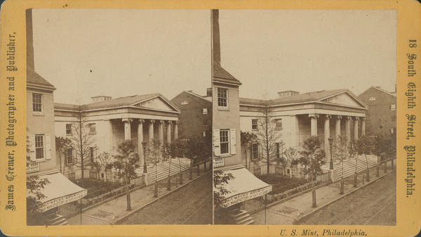 View looking east from Thirteenth Street showing the second mint building at 1331-1337 Chestnut Street (northwest corner of Juniper and Thirteenth streets) completed in 1833 after the designs of William Strickland and possibly John Haviland. The mint operated at the site until 1902 when the mint relocated and the building was razed. Includes partial view of the adjacent cigar manufactory adorned with an awning inscribed with the name of the business, Gumpert Bros.
