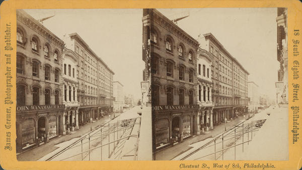 View of the commercial street, above Eighth Street, south side. Businesses include: John Wanamaker & Co. luxury clothing store (established 1869) at 818 Chestnut Street; publishers and booksellers Porter & Coates (1867-1895) at 822 Chestnut Street; and the Continental Hotel (completed 1860 after designs of John McArthur, Jr.) at the corner of Ninth and Chestnut streets. Mannequins stand in front of the doorway of the Wanamaker store.