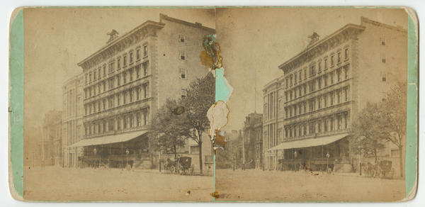 View from above Chestnut Street showing the hotel at Broad and Sansom streets opened by George W. and J.G. Edwards in 1853. The hotel built after the designs of John McArthur, Jr. was expanded and renamed the Lafayette Hotel in 1876. View also includes the adjacent buildings of the third building of the Academy of Natural Sciences (1840-1876) and the Union League (built 1865) at Broad and Sansom streets. A horse-drawn carriage rests near the hotel.
