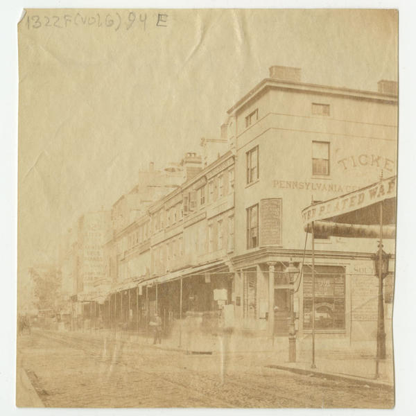 View showing the north side of the 900 block of Chestnut Street. Businesses include: the Pennsylvania Central Railroad ticket office (901 Chestnut); Richelderfers, gentlemen's furnishings (903 Chestnut); and J.E. Gould, piano and organ dealer (923 Chestnut). Railroad ticket office heavily adorned with signage. Also includes partial view of an awning inscribed "[sil]ver plated war[es]" adorning the business on the adjacent corner of Ninth and Chestnut streets.