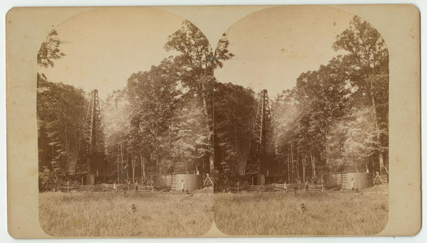 View showing a gas well in a wooded area in Butler County. Laborers stand between the enclosed derrick and gas tanks. Butler County contained the most productive gas fields in the United States in the late 19th century.