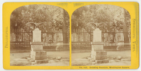 View of the first public drinking fountain erected by the Philadelphia Fountain Society in the spring of 1869 on the sidewalk at 7th and Walnut Streets near Philadelphia's Washington Square. An eagle with outstretched wings perches on a tablet at the top of the fountain inscribed: Philadelphia Fountain Society, Instituted A.D. 1869. Below the tablet are an upper and lower water troughs for the use of horses and dogs. A high wrought iron fence separates the trees and benches of the park from the sidewalk. The Society paid William H. Radford $70.00 for his work on the fountain's plumbing; $100 to Robert Wood & Co. iron workers for making the eagle; and $242.75 to Broders Walsh & Co. for their stonework.