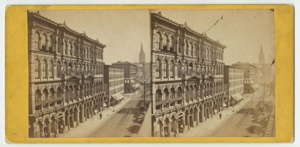 View showing the oldest U.S. business school, established by Peter Duff in 1840, on Fifth Street in Pittsburgh, Pennsylvania. View also shows adjoining businesses, including: Pennsylvania Insurance Company, Allegheny Insurance Company, and the Morning Post stationery and printing shop. The Morning Post building is adorned with a playbill advertising a minstrel show. Pedestrians walk on the sidewalk.
