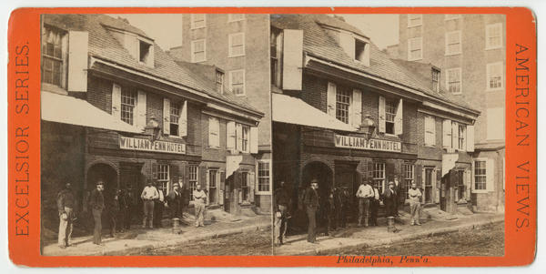 View showing the William Penn Hotel on Letitia Street between Market and Chestnut streets. A group of working-class men stands near a fire hydrant in front of the hotel. View also includes the adjacent building incorrectly identified by 19th-century historians as the Letitia Penn House, which was wrongly recorded as built in 1682 by William Penn and given to his daughter in 1701. Signage decorated with a beer keg adorns the misidentified Penn house.