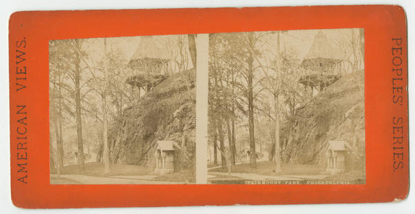 Copy stereoview of a view looking northwest from the south garden at the Fairmount Water Works on the Schuylkill River. Shows Reservoir Hill adorned with one of the rustic pavilions installed at the waterworks between 1864-1866 as a decorative improvement. View also shows a pitched-roof monument attached to the base of the hill in the foreground and the "Diana" statue (installed circa 1831) near the base of the inclined walkway to the hill. The waterworks, originally constructed between 1812 and 1822, were altered and expanded until 1872.