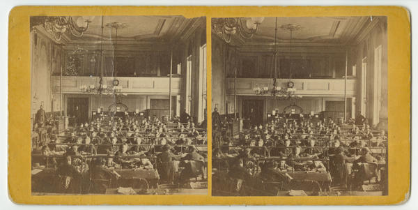 Shows a classroom of male students, including young boys, at the business school, later renamed Peirce's Business College, at 931 Chestnut street. View also includes a manned registration desk adorned with signage reading "Thomas M. Peirce & Co.," instructors, a gallery, and chandeliers.