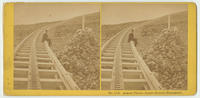 View of a monument adjacent to the Mount Washington Cog Railway. The monument, constructed of rocks and a marker, memorializes Lizzie Bourne, a 23 year-old hiker, who died September 14, 1853 while attempting to ascend Mount Washington. The railway organized and directed by Sylvester Marsh was completed in 1869. Shows a man sitting on the tracks directly opposite the monument.