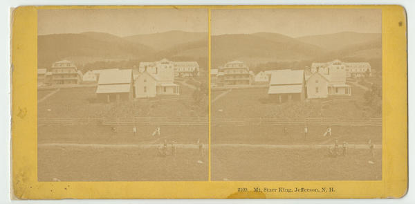 Shows the mount named after Universalist Rev. Thomas Starr King in the White Mountains. In the foreground, men and boys sit and stand in a pasture in front of a farm and hotel buildings.