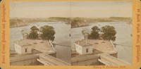 View showing a section of the Fairmount Water Works on the Schuylkill River. Depicts the terrace of the new mill house built on the mound dam from 1860-1862 after the designs of engineer Henry P.M. Birkinbine. Also shows one of the pavilions of the old mill house, the pavilion at the end of the pier of the mound dam, and a boathouse on the east bank of the river in the upper right corner of the image