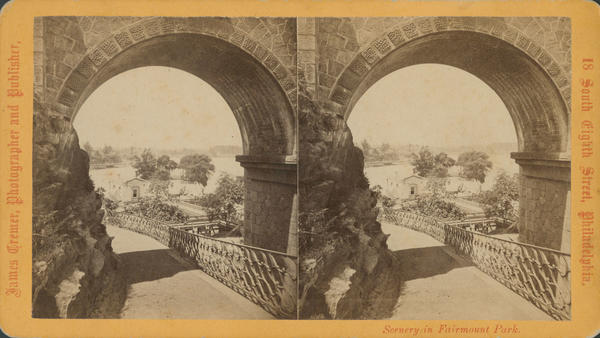 View looking northwest through the observatory tower arch at the basin of the Fairmount Water Works on the Schuylkill River. Shows the path with ornate iron railing leading to the terrace of the new mill house built between 1859 and 1862 on the mound dam after the designs of engineer Henry P.M. Birkinbine. Also shows a pavilion of the old mill house and the pavilion on the pier of the mound dam. The waterworks, originally designed by Philadelphia engineer Frederick Graff, were altered and expanded by Philadelphia engineers Henry P.M. Birkinbine and Frederick Graff, Jr.