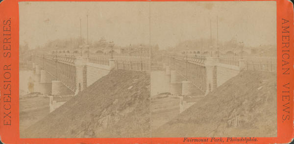 View from the banks of the Schuylkill River of the Girard Avenue Bridge at Fairmount Park, Philadelphia. The Connecting Railroad Bridge [i.e. Juntion Railroad Bridge] is visible in the background. Measuring 100 feet wide, the iron and stone Girard Avenue Bridge, built between 1872 and 1874, was considered to be the widest bridge in the world at the time of its construction. It replaced an earlier bridge at this site. The bridge, designed by James and Henry Sims, was demolished between 1970 and 1971.