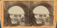 View looking northwest through the observatory tower arch at the basin of the Fairmount Water Works on the Schuylkill River. Shows the path with ornate iron railing leading to the terrace of the new mill house built on the mound dam between 1859 and 1862 after the designs of engineer Henry P.M. Birkinbine. Also shows a pavilion of the old mill house and the pavilion on the pier of the mound dam. The waterworks, originally built between 1812 and 1822 after the designs of Philadelphia engineer Frederick Graff, were altered and expanded after the designs of Philadelphia engineers, Henry P.M. Birkinbine and Frederick Graff, Jr.