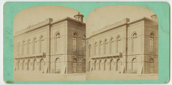 View of front and partial side facade of brick and sandstone Italiantate style building. Architects Napoleon LeBrun and Gustav Runge formed a short lived partnership to win the design competition. Building constructed 1855-1857.