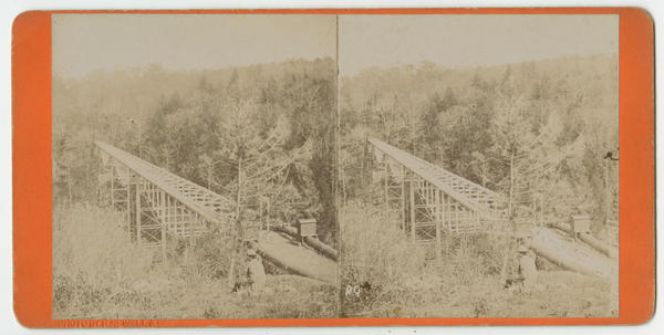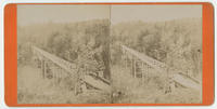 View showing the water pipes called the Pipe Bridge over the Wissahickon Creek. The pipe aqueduct, constructed in 1870 to provide water to Germantown from the Schuylkill River via the Mount Airy reservoir, was built after the designs of engineer Frederick Graff, Jr. It was razed in 1891. In the foreground, a man sits on a cliff near the pipe bridge.