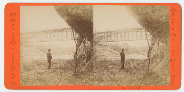 View showing Eagle cliff near the old Girard Avenue Bridge spanning the Schuylkill River. Also shows a man standing on the