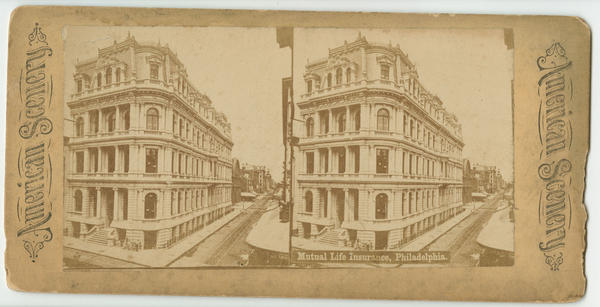 View from the corner of Tenth and Chestnut streets showing the Philadelphia headquarters of the Mutual Life Insurance Company of New York (incorporated 1841). Built from 1874-1875 after the designs of New York architect Henry Fernbach, the building at 1001-1013 Chestnut Street, also known as the Victory Building, served as the insurance company's regional headquarters from 1875 to 1920. View also shows adjacent businesses on Tenth Street.