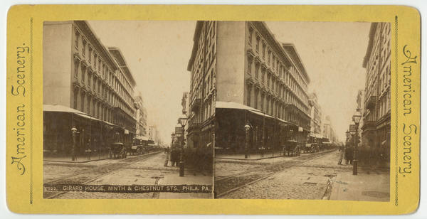View looking east from above Ninth Street showing the Girard House hotel, built from 1851-1852 after the designs of John McArthur, Jr., at 823-835 Chestnut Street. Horse-drawn carriages are parked in front of the hotel. Also shows partial view of the Continental Hotel, also built after the designs of McArthur from 1857-1860, on the south side of the street. A street lamp with an advertisement for the Chestnut Street Theater stands in front of the Continental.