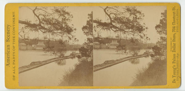 View looking from the west bank of the Schuylkill River showing the Fairmount Water Works and Schuylkill Canal lock. Shows