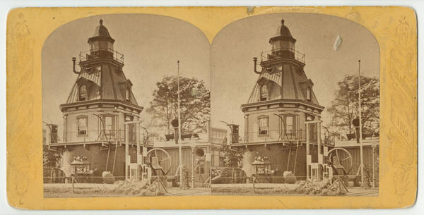 Exterior view of a lighthouse and a nearby horn, bell, and other equipment built as part of the Centennial exhibition in Philadelphia's Fairmount Park.