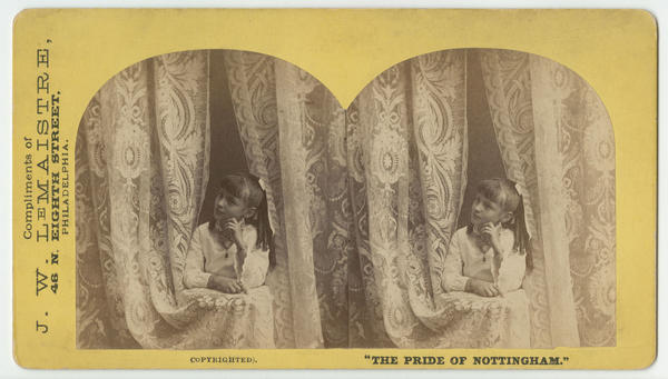 Stereographic trade card for lace merchant John W. Le Maistre. Depicts a young girl attired in lace cuffs and a lace collar posed between lace curtains. She leans on a table camouflaged by the curtain. Her head is tilted to the left and resting on her hand. Contains promotional information printed on the back by Philadelphia printers M'Calla & Stavely (237-9 Dock Street) advertising lace and embrodiered goods sold at the dry goods store. Merchandise includes: Nottingham lace curtains; Hamburg embroideries; ladies and gents collars; toilet boxes; linen towels; and pocketbooks.