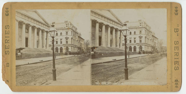 View showing the U.S. Customhouse (1845 to 1935) at 420 Chestnut Street, formerly the Second Bank of the United States, and the U.S Post Office (1863-1884) at 426-428 Chestnut Street. Customhouse building built in 1824 after the designs of Philadelphia architect William Strickland. Also shows a lamppost in the foreground; a vendor's stand near the Customhouse; men convening near the post office; and adjacent businesses, including W.F. Warbuton and Son's hat manufactory (430 Chestnut) and Moss & Co., blank books and stationery (432 Chestnut).