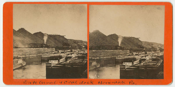 View showing the Delaware and Hudson Canal Company boat and coal dock on the canal. The Delaware and Hudson canal, constructed from 1825-1828 after the designs of engineer Benjamin Wright, was conceived by Philadelphia merchants, William and Maurice Wurtz, as a means to transport anthracite coal from northeastern Pennsylvania to New York. Depicts in the foreground, workers standing on one of several docked canal boats used to transport coal hauled to Honesdale by the Pennsylvania Coal Company gravity railroad. In the background, a Pennsylvania Coal Company locomotive steams down the tracks past mountains of coal.