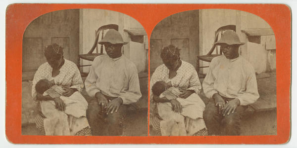 Stereograph depicting an African American mother seated on the porch steps and nursing her baby. The woman, wearing her hair tied up in braids and attired in a polka-dotted shirt and a checked skirt, cradles an infant on her lap as it suckles on her breast. Seated in the right, the African American man, attired in a hat, a long-sleeved white shirt, a ring, and pants, looks over at the mother and child. On the porch is a wooden chair beside the closed door.