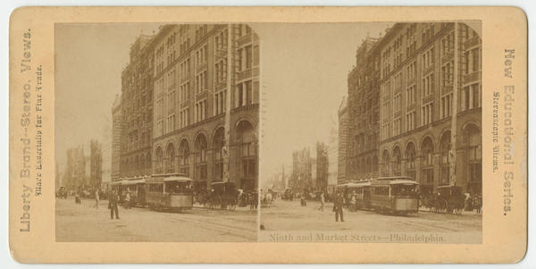 View looking east from Ninth Street showing the south side of the 800 block of Market Street. Depicts Gimbel Brother's Department Store, opened in 1894, at the southeast corner of Ninth and Market streets. Street and pedestrian traffic includes trolleys and horse-drawn carriages.