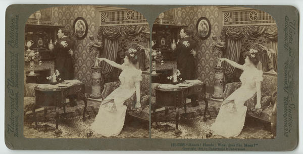 Three genre scenes set in a well-decorated parlor from a comic stereograph series satirizing the exploits of an adulterous