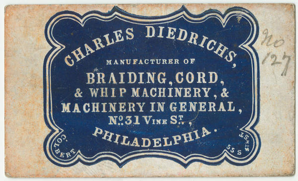 Charles Diedrichs, manufacturer of braiding, cord, & whip machinery, & machinery in general, No. 31 Vine St., Philadelphia. [graphic].