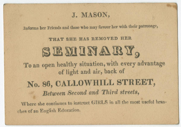 J. Mason, informs her friends and those who may favour her with their patronage, that she has removed her seminary, to an open healthy situation, with every advantage of light and air, back of No. 86 Callowhill Street, between Second and Third Streets, where she continues to instruct girls in all the most useful branches of an English education. [graphic].