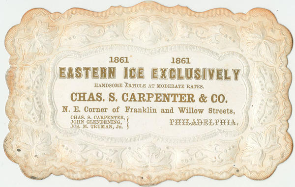 Chas. S. Carpenter & Co. N.E. corner of Franklin and Willow Streets, Philadelphia. [graphic] : 1861. Eastern ice exclusively handsome article at moderate rates. Chas. R. Carpenter, John Glendening, Jos. M. Truman, Jr.