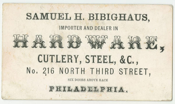 Samuel H. Bibighaus, importer and dealer in hardware, cutlery, steel, &c., No. 216 North Third Street, six doors above Race, Philadelphia.