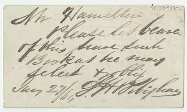 Manuscript note on verso: Mr. Hamilton? Please let bearer of this have such brok? [illegible] he may select & oblige? [illegible] July 27/64.
