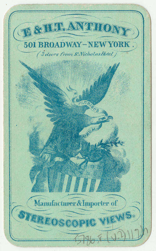 Advertising text printed on rectos for E. & H.T. Anthony, 501 Broadway - New York (3 doors from St. Nicholas Hotel), manufacturer, publisher, and importer of photographic materials, carte de visite photographs, stereoscopic views, and card portraits of eminent persons.