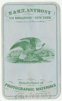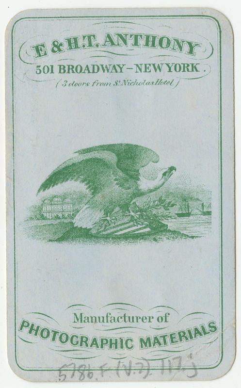 Advertising text printed on rectos for E. & H.T. Anthony, 501 Broadway - New York (3 doors from St. Nicholas Hotel), manufacturer, publisher, and importer of photographic materials, carte de visite photographs, stereoscopic views, and card portraits of eminent persons.
