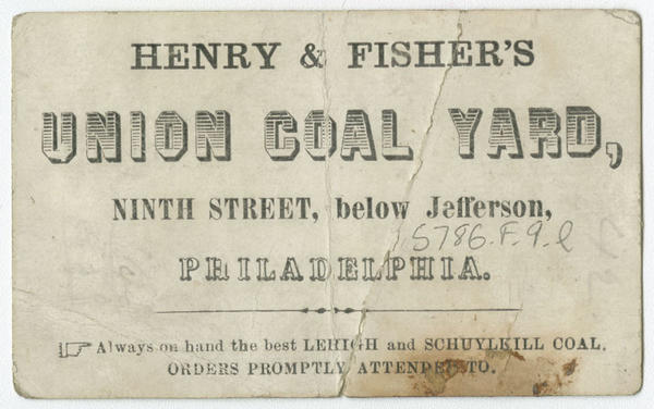 Henry & Fisher's union coal yard, Ninth Street, below Jefferson, Philadelphia. [graphic] : Always on hand the best Lehigh and Schuylkill Coal. Orders promptly attended to.