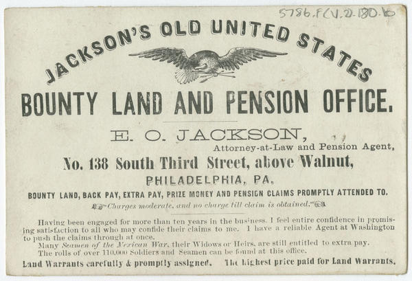 Jackson's old United States bounty land and pension office. E.O. Jackson, attorney-at-law and pension agent, No. 138 South Third Street, above Walnut, Philadelphia, Pa. [graphic] : Bounty land, back pay, extra pay, prize money and pension claims promptly attended to. Charges moderate, and no charge till claim is obtained. Having been engaged for more than ten years in the business, I feel entire confidence in promising satisfaction to all who may confide their claims to me. I have a reliable agent at Washington to push the claims through at once. Many seamen of the Mexican War, their widows or heirs, are still entitled to extra pay. The rolls of over 110,000 soldiers and seamen can be found at this office. Land warrants carefully & promptly assigned. The highest price paid for land warrants.
