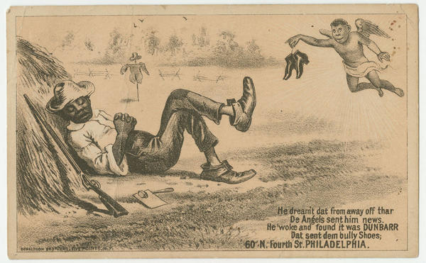 He dreamt dat from away off thar de angels sent him news. He 'woke and found it was Dunbarr dat sent dem bully shoes; 60 N.