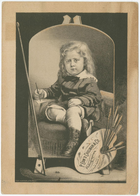 Illustrated trade card depicting a portrait painting displayed on an easel of a child seated and posed with a pen and a piece of paper. A large painting palette with paint brushes running through the finger hole rests in front of the painting in the lower right corner.