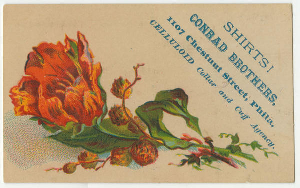 Series of illustrated trade cards for Conrad Brothers' men's clothing store depicting sprigs of various flowers. Conrad Brothers was a partnership between J. Fletcher and Benson W. Conrad.