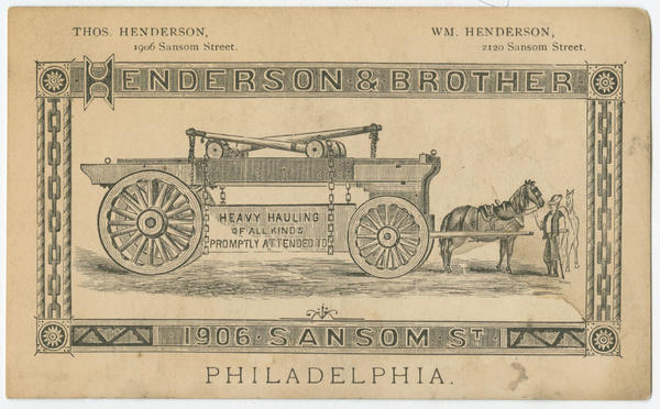 Henderson & Brother, 1906 Sansom St., Philadelphia. [graphic] : Thos. Henderson, 1906 Sansom Street. Wm. Henderson, 2120 Sansom Street. Heavy hauling of all kinds promptly attended to.