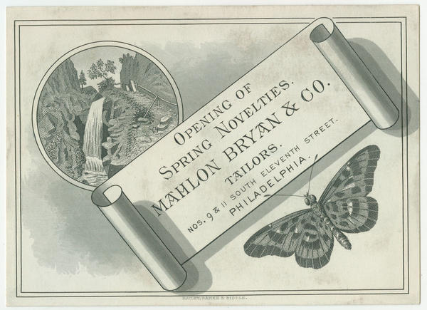 Illustrated trade card depicting a waterfall, butterfly and scroll inscribed with the title. Mahlon Bryan & Co. was a partnership between tailor Mahlon Bryan and cutter Dagobert M. Rattay