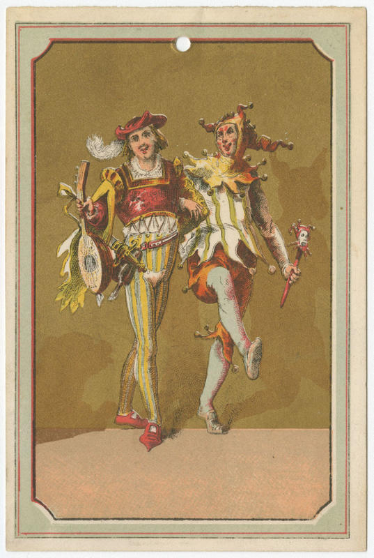 Illustrated trade card depicting two jesters standing arm-in-arm. One jester wears a floppy three-point hat with jingle bells