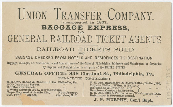 Advertising text printed on verso: Union Transfer Company. Incorporated in 1867. Baggage express, general railroad ticket agents. Railroad tickets sold and baggage checked from hotels and residences to destination. Baggage, packages, &c., transferred to and from all parts of the cities of Philadelphia, Baltimore and Washington, or forwarded by express and freight lines to all parts of the United States. General office: 838 Chestnut Street., Philadelphia, Pa. Lists branch offices in two columns.