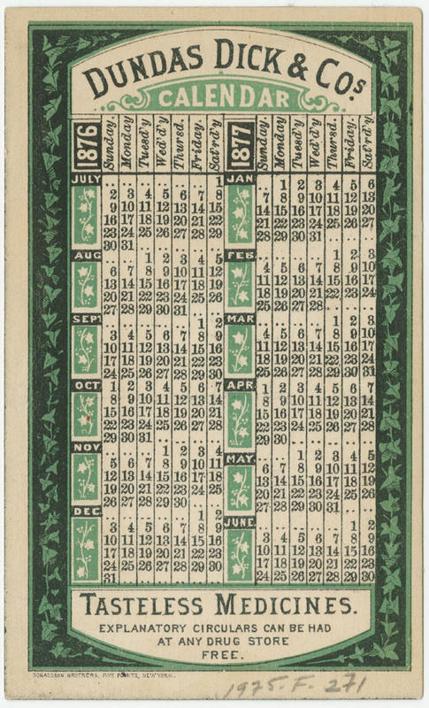 Contains calendars for 1876 and 1877 printed on verso.