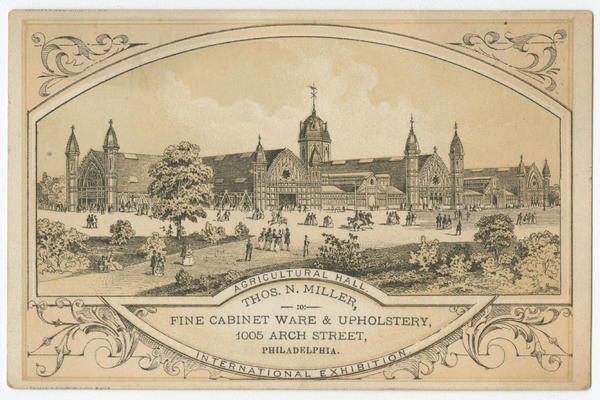 Series of illustrated trade cards depicting two exhibition buildings constructed for the Centennial Exhibition in Fairmount Park in Philadelphia, including Agricultural Hall built after designs by James H. Windrim and Horticultural Hall built after designs by Henry Schwarzmann. Both scenes include horse-drawn carriages and pedestrian foot traffic in the foreground and are surrounded by decorative filigree. The fair celebrated the centennial of the United States through an international exhibition of industry, agriculture, and art.