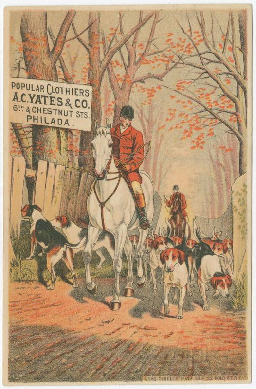 Series of illustrated trade cards for A.C. Yates & Co. clothing store, which began operations on the ground floor of the Public