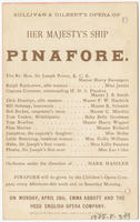 Advertising text printed on verso promotes the benefit performance of Sullivan & Gilbert's comic opera "Her Majesty's Ship Pinafore" and includes a list of characters and actors.