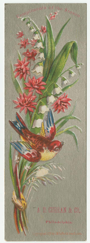 Series of illustrated trade cards and bookmarks for the confectionery businesses operated by Arthur S. and John C. Curran, Jr. and Sigismund Leipzeiger at 1324 Chestnut Street and 475 North Fifth Street in Philadelphia. Illustrations depict flowers and birds and include the phrase, "compliments of the season".